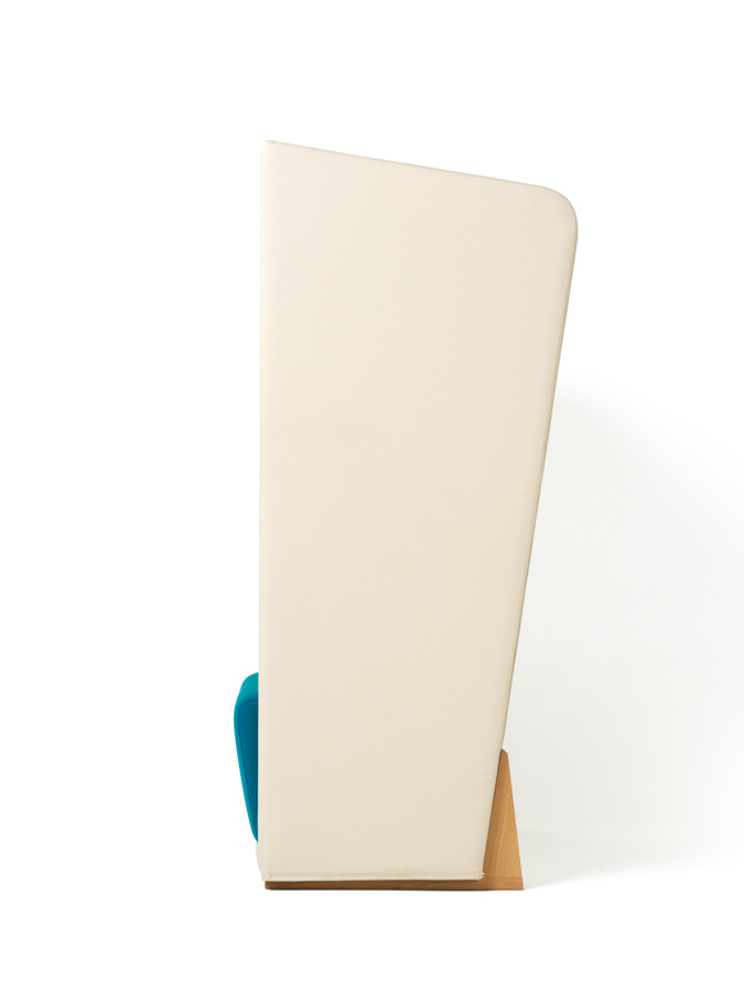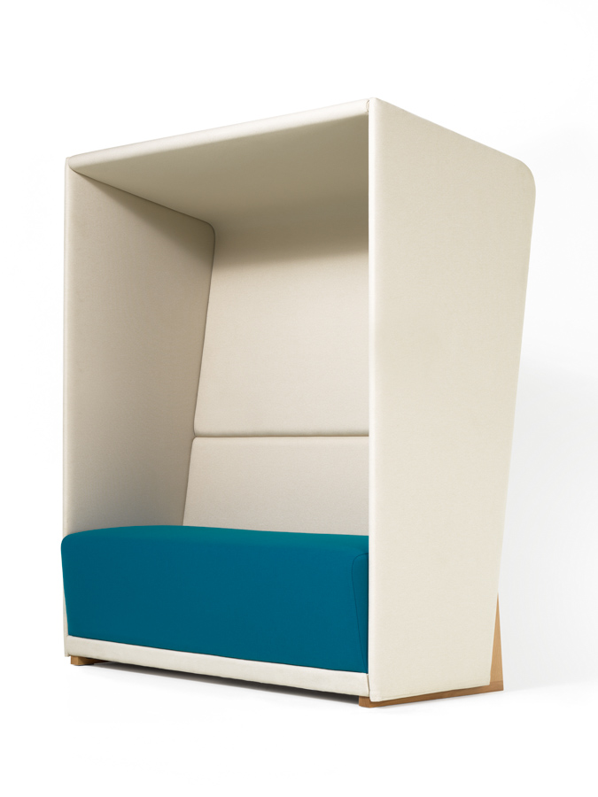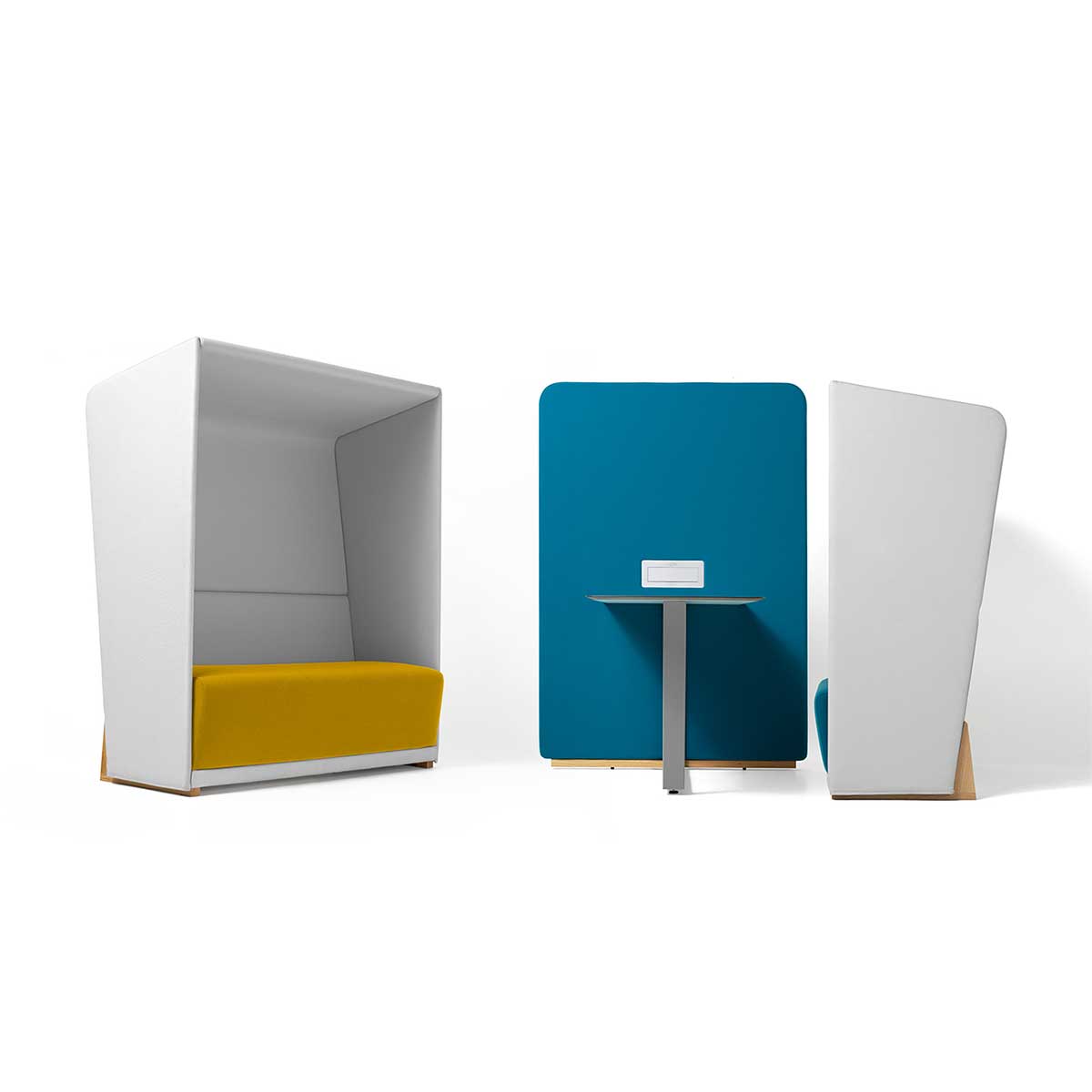 Canapé deux places et fauteuil haut dossier aux lignes épurées, conçus pour offrir une solution d’assise confortable et confidentielle.
