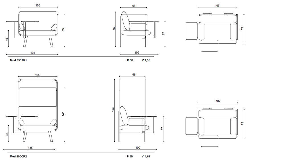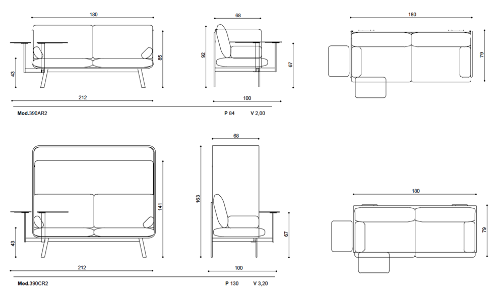 Structure du châssis et pieds en acier tubulaire rectangulaire avec extrémités en polyéthylène. Structure périmétrale interne des joues latérales et de l’auvent en tôle d’acier tubulaire avec revêtement en tissu canneté. Rembourrage de l’assise, du dossier, des accoudoirs et de la structure externe en mousse de polyuréthane autoextinguible à densités différenciées. Rembourrage de la structure interne en aggloméré de polyuréthane recyclé. Assise et dossier en contreplaqué de bouleau.