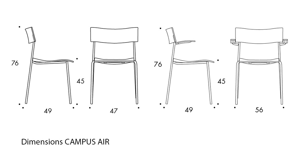 Campus Air possède une assise et un dossier en plastique polyamide renforcé de fibre de verre. Disponible en versions piètement quatre pieds ou luge, Campus Air réussit les tests d’inflammabilité California TB 133 et est 100 % recyclable. Avec son cadre résistant aux intempéries en option, Campus Air peut même être utilisé en extérieur. Campus Air est empilable et peut être relié, et se gère facilement avec le chariot Campus.