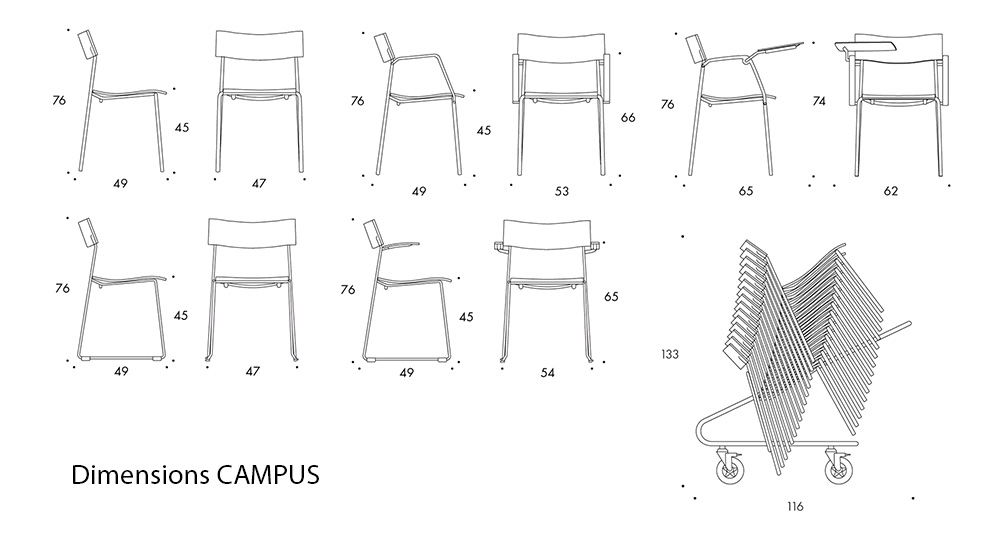 Disponible en chaise et en fauteuil, Campus se décline en plusieurs variantes, avec quatre pieds ou piètement luge. Assise et dossier en placage, ou avec assise rembourrée / assise et dossier rembourrés. Campus est empilable ; Campus peut être reliée ; Campus se transporte facilement grâce à son chariot. Campus s’intègre parfaitement aux espaces de conférence, de bureau, institutionnels et résidentiels grâce à son style discret et performant.